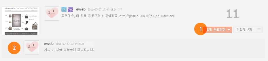 - °ø±¸¸¦ Á¦¾ÈÇÑ »óǰ Áß ³ªµµ µ¿ÀÏÇÑ »óǰ¿¡ ´ëÇØ °ø±¸¸¦ Èñ¸ÁÇÑ´Ù¸é ¾Æ·¡ Âü°í±×¸² 1¹øÀÇ ÇÔ²² ½ÅûÇϱ⠹öưÀ» Ŭ¸¯ - Ŭ¸¯½Ã Èñ¸Á ¹®±¸¸¦ ÀÔ·ÂÇÒ ¼ö ÀÖ°í ÇØ´ç »óǰÀÌ °øµ¿±¸¸Å°¡ ÁøÇàµÉ ½Ã À̸ÞÀϰú SMS·Î ¾Ë¶÷À» ¹ÞÀ»Áö ¿©ºÎµµ ¼±Åà ÇÒ ¼ö ÀÖ½À´Ï´Ù. - Èñ¸Á±ÛÀ» ÀÔ·ÂÇÒ °æ¿ì ¾Æ·¡Âü°í±×¸² 2¹ø¿µ¿ª¿¡ ÀÚ½ÅÀÌ ¾´±Û°ú SNS»çÁøÀÌ º¸¿©Áý´Ï´Ù. |