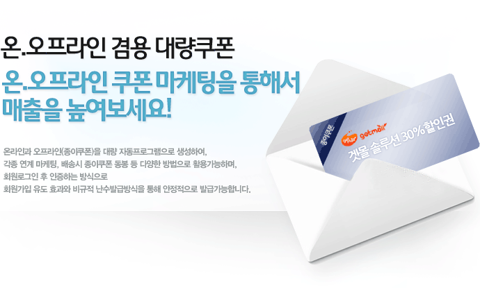 ÄíÆùÀ» »ý¼ºÇÑ ÈÄ, »ý¼ºµÈ ÄíÆù¹øÈ£¸¦ ¿ÀÇÁ¶óÀÎ ÄíÆù¿¡ Àμ⸦ ÇÏ¿© °í°´¿¡°Ô Áö±ÞÀ» ÇÏ¸é °í°´Àº ÄíÆù¹øÈ£¸¦ ¼îÇθô¿¡¼­ µî·ÏÇÑ ÈÄ »ç¿ëÇÒ ¼ö ÀÖ½À´Ï´Ù. ÀÌÁ¦ ¿Â¶óÀÎ ¸¶ÄÉÆÃ »Ó¸¸ ¾Æ´Ï¶ó, ¿ÀÇÁ¶óÀÎ ÄíÆù ¸¶ÄÉÆÃÀ» ÅëÇØ¼­ ¸ÅÃâÀ» ³ô¿©º¸¼¼¿ä.